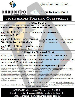 Los y las invitamos a participar de las actividades que estamos organizando en las comunas de la Ciudad. Acá van las actividades para los próximos días en el local de Comuna 4, Caseros 3225, frente al parque.
